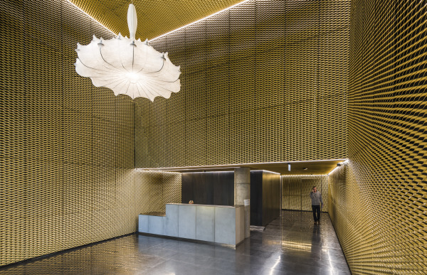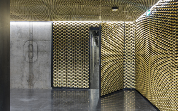 Przykładem jest recepcja w budynku B, która swoją „fakturą” ma budzić skojarzenia z koszykami. Na ścianach znajduje się siatka emitująca blask ażurowego złota. - Efekt ten uzyskaliśmy dzięki zastosowaniu autorsko wykonanej mosiężnej siatki cięto-ciągnionej. Blachę sprowadzono z Francji do Czech, gdzie była nacinana i rozciągana. Następnie, już w Polsce, blacha trafiła do lakierowana, po czym montowaliśmy ją na wszystkich ścianach i sufitach otaczających recepcję – dodaje Łukasz Łoziński z Tétris. Industrialny efekt tego wnętrza dopełnia posadzka holu zrobiona ze stalowych płyt, a także surowe ściany recepcji wykonane z czarnej blachy gorącowalcowanej.