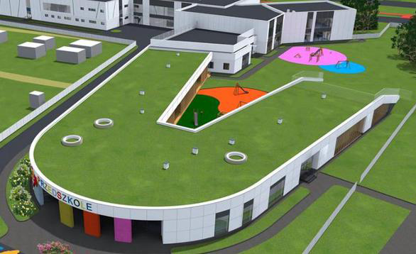 Kompleks składał się będzie z trzech części: przedszkola, szkoły podstawowej oraz hali sportowej. Dla parterowej części przedszkolnej przewidziano zielony dach. Z kolei obiekt szkolny zajmie dwie kondygnacje, natomiast salę sportową zaprojektowano jako jednokondygnacyjną. W projekcie uwzględniono również m.in. dwa place zabaw, przystosowane do dzieci z różnych grup wiekowych, dwa boiska i bieżnię. Wykonawca będzie również odpowiedzialny za wykonanie elementów małej architektury, dwóch zjazdów - z ul. Perkuna i ul. Jana Nowaka-Jeziorańskiego, oraz parkingów. Na terenie nowej szkoły posadzonych zostanie 225 drzew owocowych i krzewów, pojawią się też donice z zielenią.