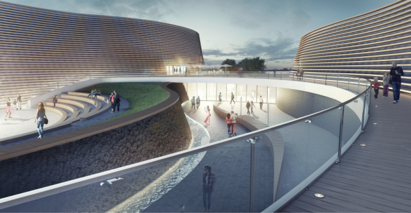 Zwycięski projekt czerpie z inspiracji dwubiegunowego miasta. Dzięki swoim kształtom maksymalnie wykorzystuje ukształtowanie terenu oraz nasłonecznienie nawiązując do historycznej kaskady wodnej. Centralną część budynku – hol wejściowy – jest wyeksponowany za pomocą alei lipowej. Binarny hol, stanowi most łączący oba skrzydła budynku dostępne z każdej strony. W centrum kompleksu pojawia się strefa publiczna - ogólnodostępna zarówno z zewnątrz jak izkażdej strefy wewnętrznej. Przy punkcie widokowym na rzekę i kaskadę wodną umiejscowiono kawiarnię. Z kolei punkt spotkań umożliwia swobodny przepływ ludzi w górę i w dół promenady. Symbolem projektu jest rzeka. Na terenie kompleksu przewidziano edukatorium i centrum rozrywkowe z salami edukacyjnymi, których kształt został oparty o wzór chemiczny cząsteczki H2O. Hala basenowa została ujęta w formule przepływającej rzeki, natomiast baseny zewnętrzne wykorzystują różnicę terenu w sposób naturalny tworząc kaskady inastępujące po sobie baseny.